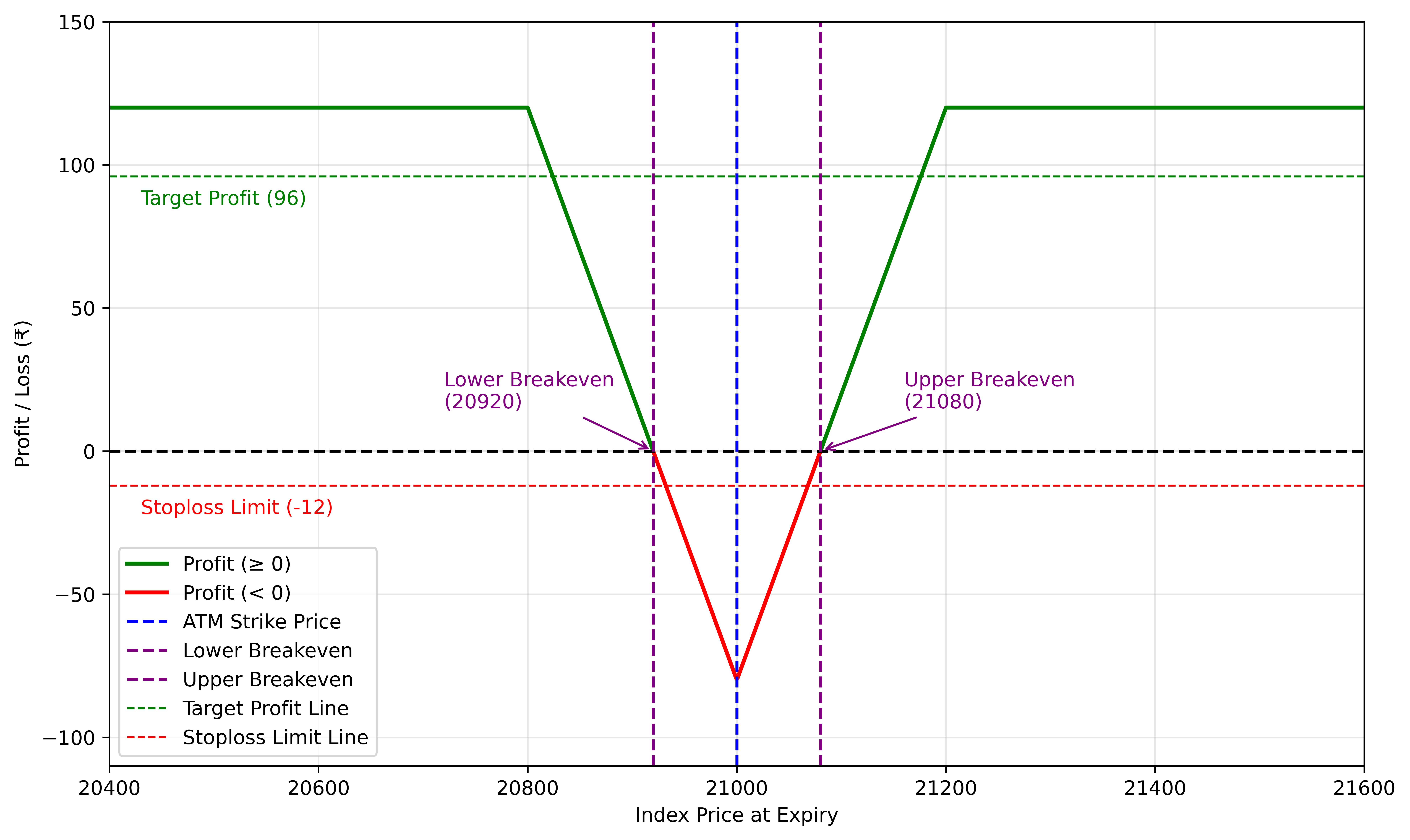 Lower Breakeven: ATM − Net Premium = 21,000 − 120 = 20,880