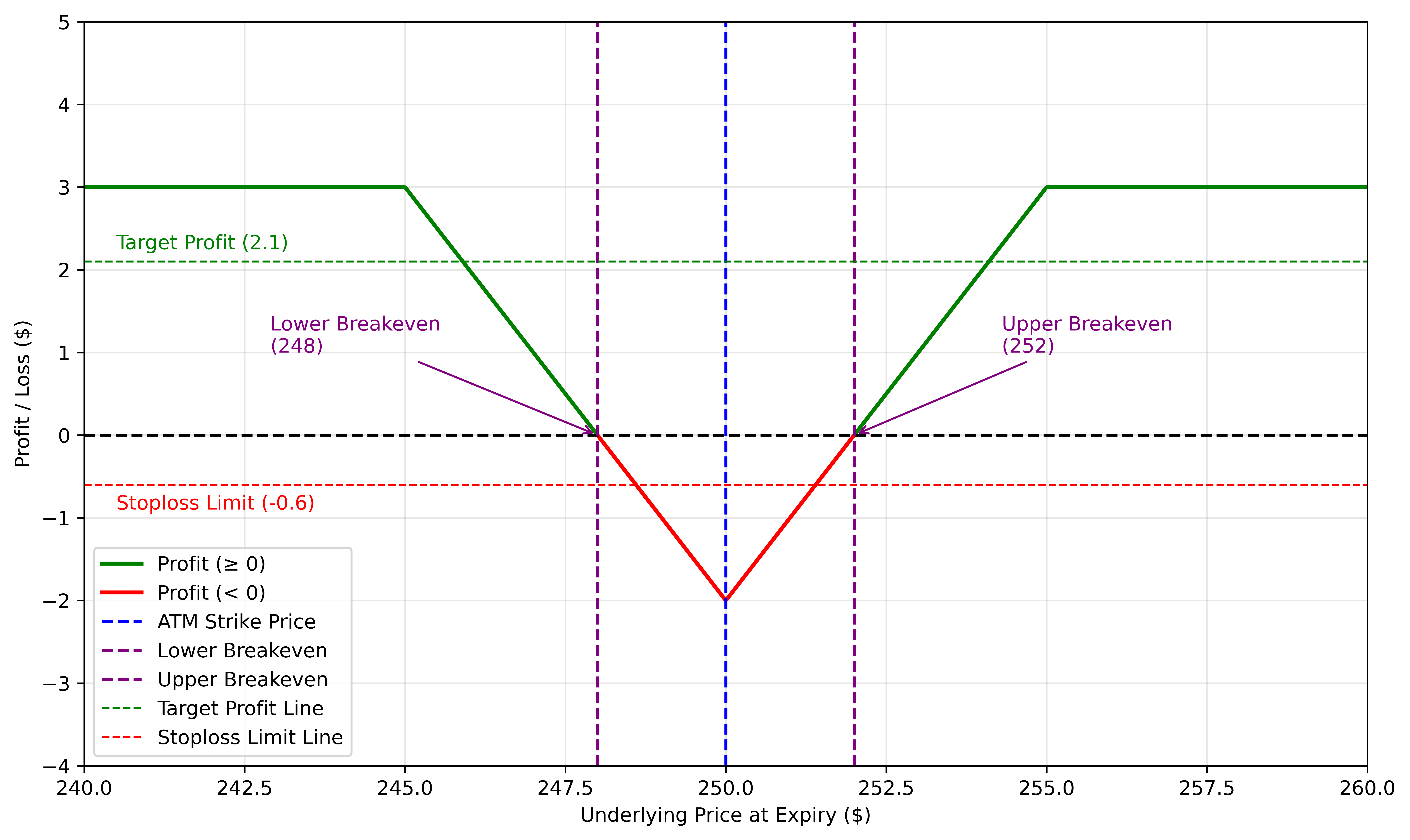 Upper Breakeven: ATM + Net Premium = $250 + $3 = $253